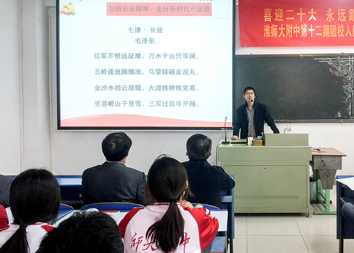 5月9日下午,马克思主义学院高轩博士应邀为附属实验中学入团积极分子讲授“弘扬长征精神,走好新时代长征路”主题团课。马克思主义学院副院长唐建兵,教师赵克军、李玉红,附中副校长张子善、高一年级组长江卫娇及80多名入团积极分子聆听讲座,讲座由附中团委书记房风波主持。